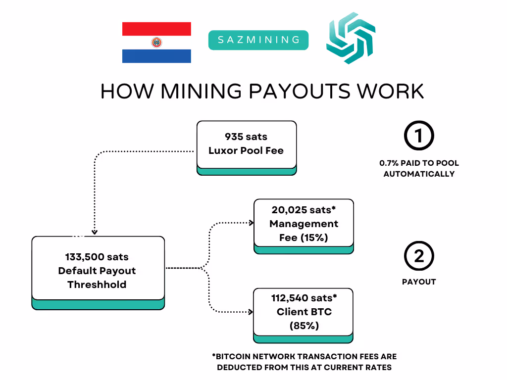Luxor charges a flat transaction fee of 7,500 sats per mining payout. This fee is shared between Sazmining and the customer according to the revenue share agreement for each site.