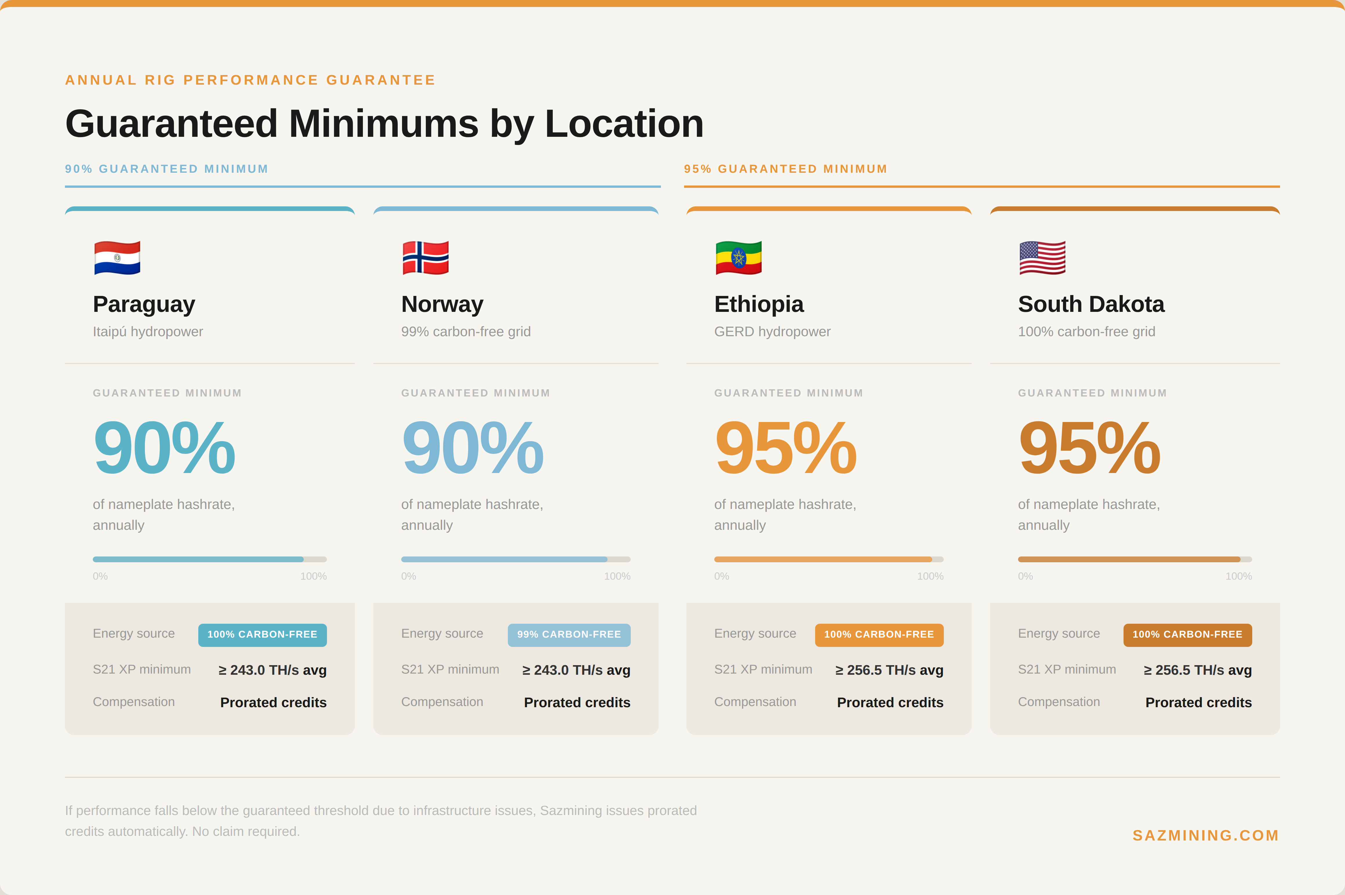Paraguay (Itaipú Hydropower) and Norway (99% Carbon-Free Grid): Your rig is guaranteed to perform at or above 90% of its nameplate hashrate over the year.