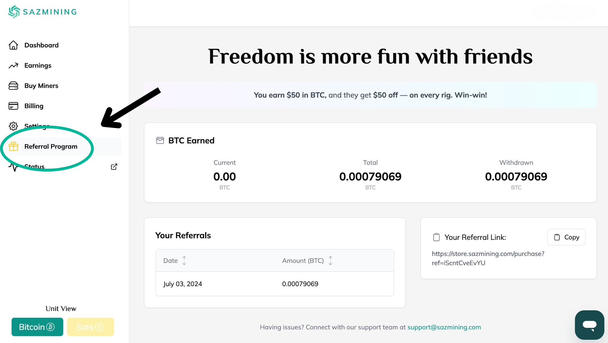 It’s all right inside your Sazmining Dashboard. Just log in, click “Referral Program” on the left-hand menu, and you’ll see your personal link ready to share.