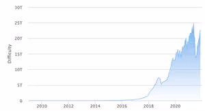 Figure 2. (from Bitcoin.com) The Bitcoin network evaluates the hashrate every two weeks and adjusts mining difficulty accordingly. As difficulty increases, so does the security of the network.