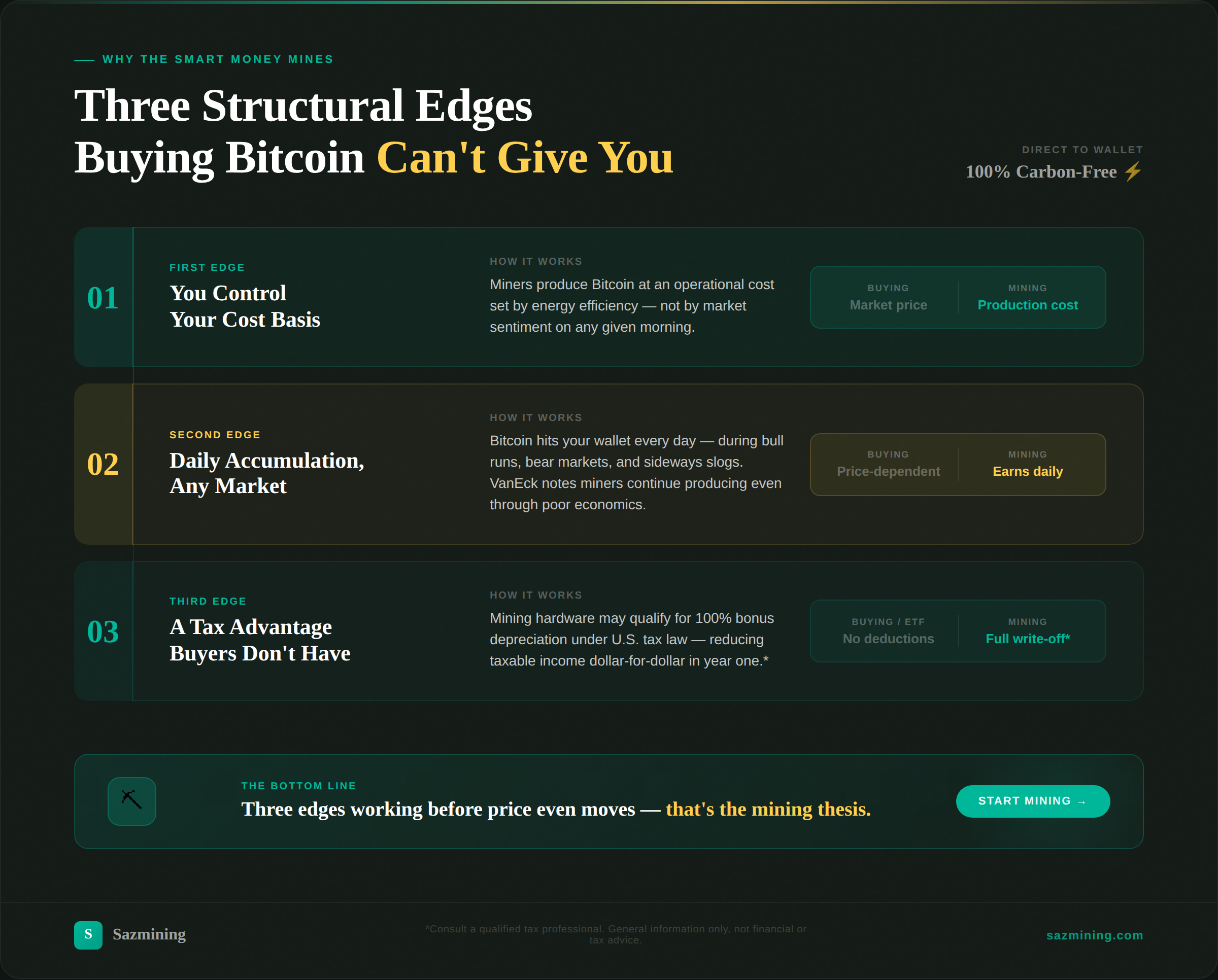 When you own the infrastructure that produces your Bitcoin, you're operating as a business, not just an investor — and the tax code treats you accordingly. A meaningful hardware investment could be written off entirely in year one, reducing taxable income dollar for dollar while your machines are producing Bitcoin daily.