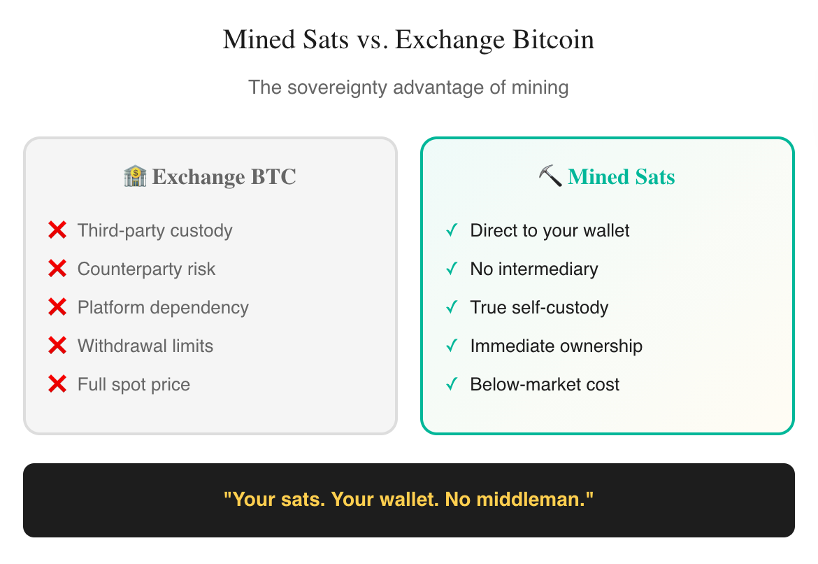 • Wild sats carry a sovereignty premium. Mining delivers KYC-free bitcoin directly to your wallet with no exchange dependency.