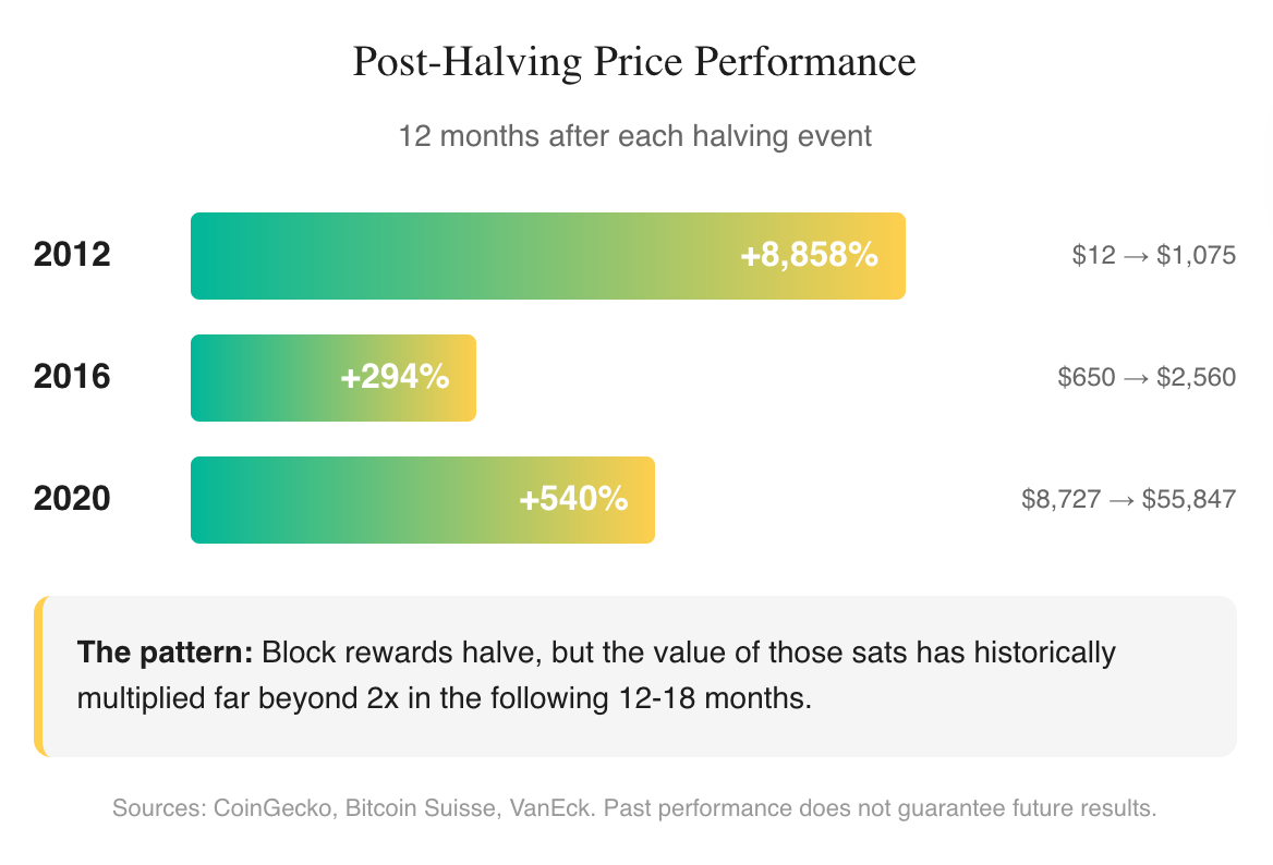 • The halving doesn't halve your wealth. Historical data shows price appreciation far exceeds the 50% reward cut over 12-18 month periods.