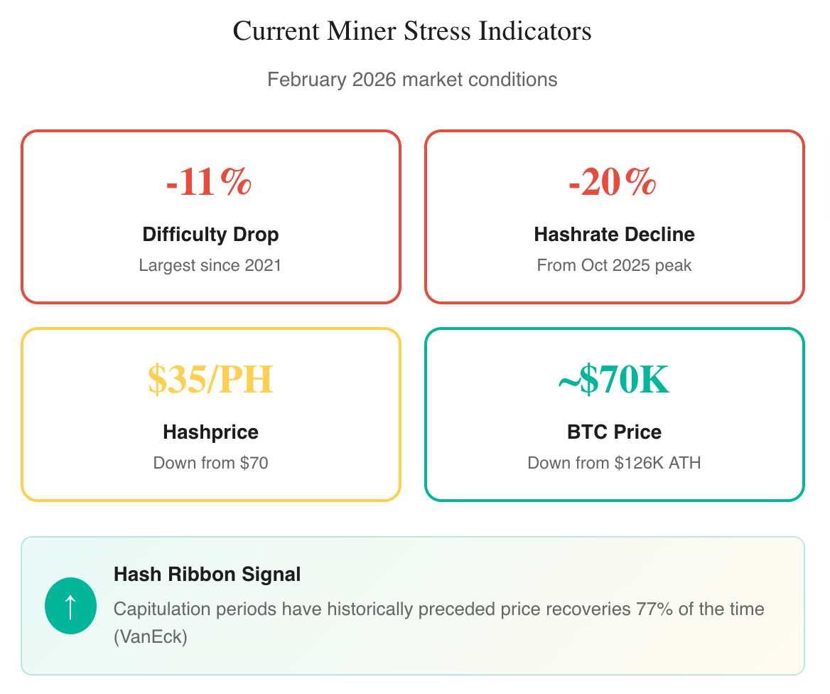 Bitcoin is trading around $70,000. Hashprice just crashed from $70 to $35. Mining difficulty dropped 11% last weekend, the largest decline since China's 2021 mining ban. Headlines are screaming about miner capitulation.